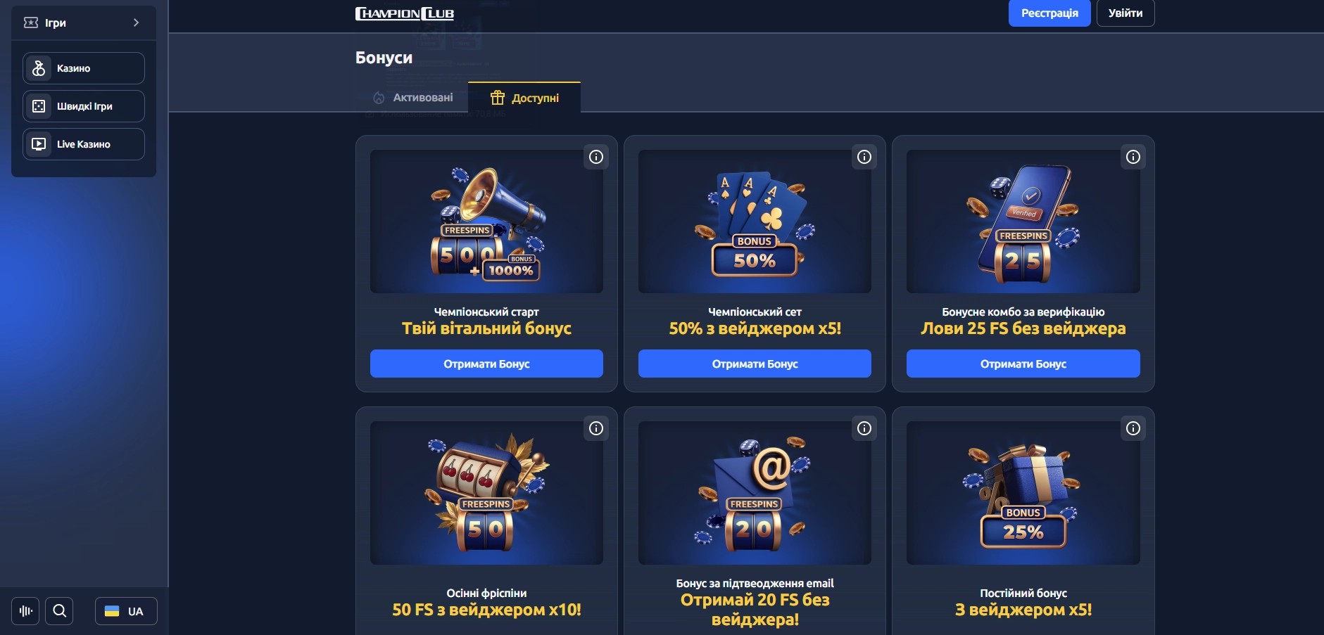- Швидка реєстрація та простий Вхід у Champion Club.