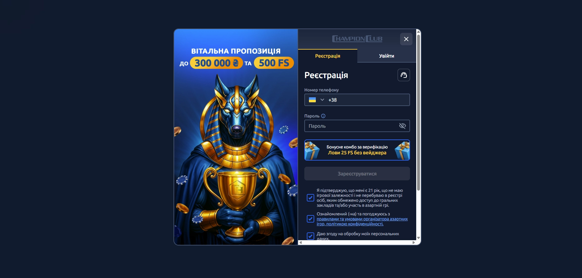 Процес Реєстрації в Чемпіон Клуб займає кілька хвилин.