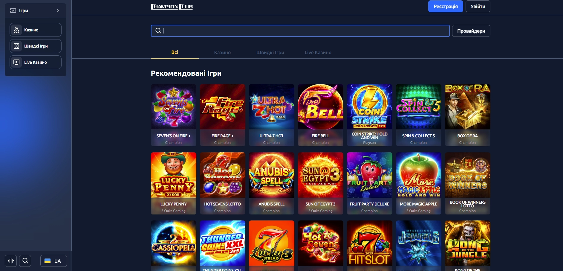 Для українських користувачів Автомати Champion Club доступні в різних жанрах: від класичних фруктових слотів до сучасних ігор з механіками Megaways і Hold’n’Link.